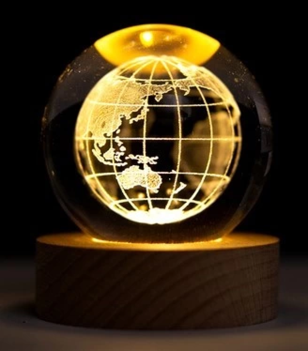 Dekoratif Dünya Tasarımlı Ahşap Altlıklı Işıklı Cam Küre Büyük Boy Cam:8cm Ahşap:2cm