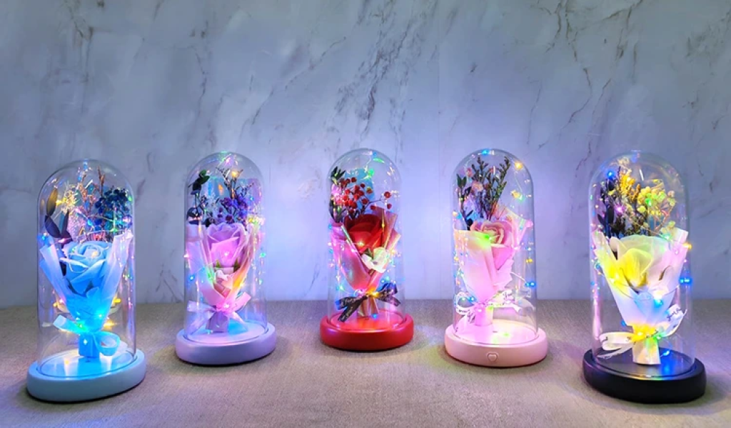 Led Işıklı Müzikli Cam Fanus İçinde Gül Buketi Alk5006