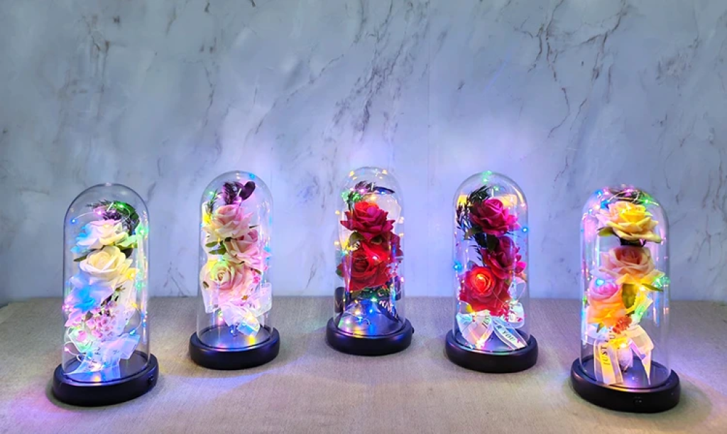 Led Işıklı Müzikli Cam Fanus İçinde Gül Buketi Alk5006