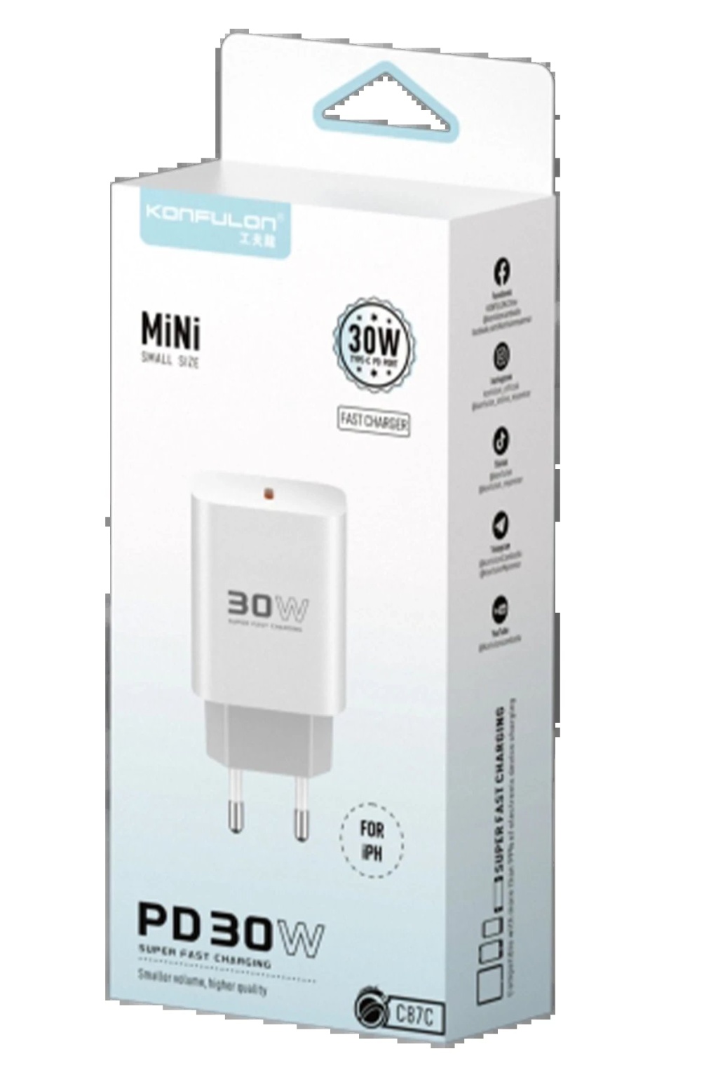 KYL06 C87C 30W Type-C Çıkışlı Ekstra DL50 1M Type-C to Lightning Kablolu PD Şarj Cihazı - Beyaz