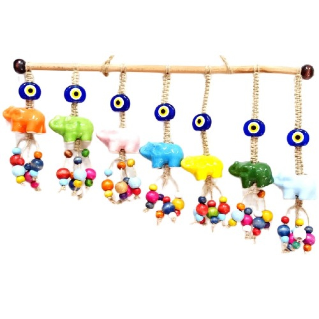 Seramik Yedi Adet Filli Nazar Boncuklu Rengarenk Tahta Boncuklu Kapı, Duvar ve Bahçe Süsü