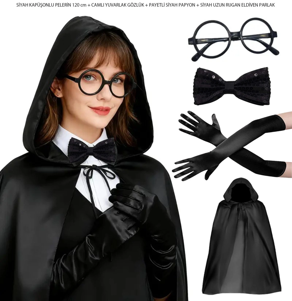 Siyah Kapüşonlu Büyücü Ve Cadı Pelerin Kostüm Seti (4 Parça)