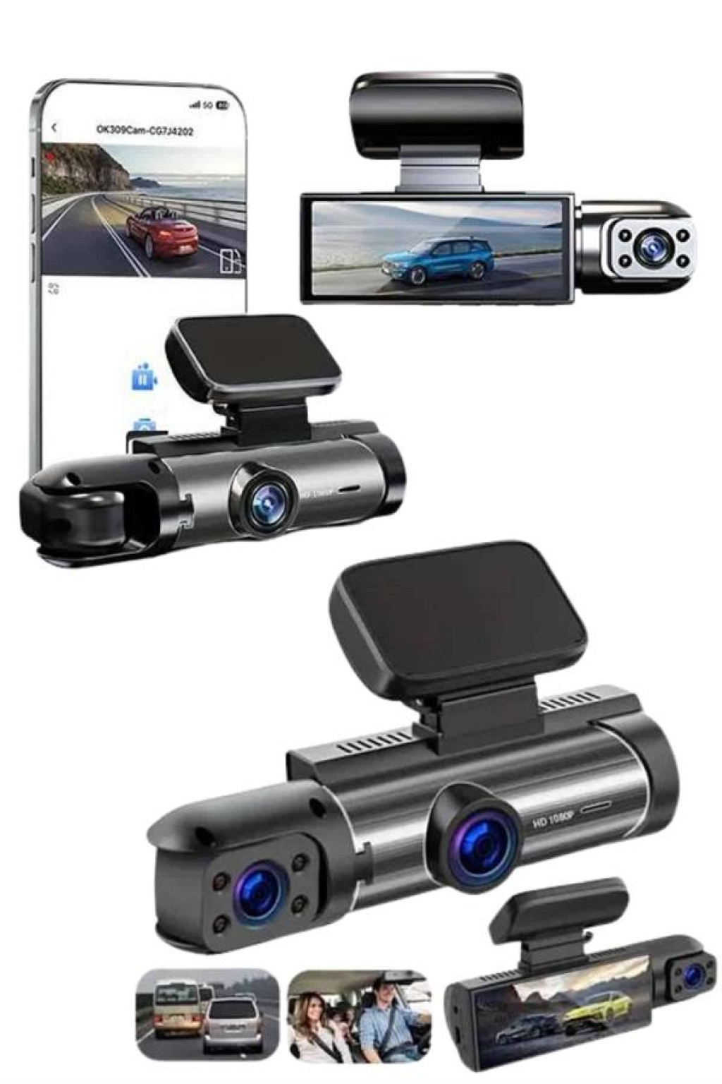 1080P 3 Lensli WİFİ Araç İçi Kameralı Ekran DVR Kaydedici Gece Görüşlü