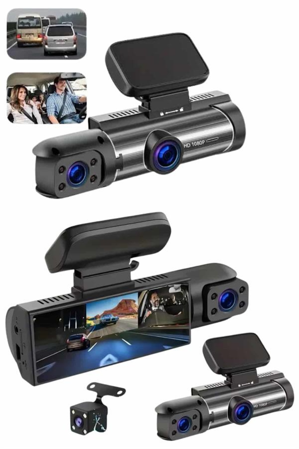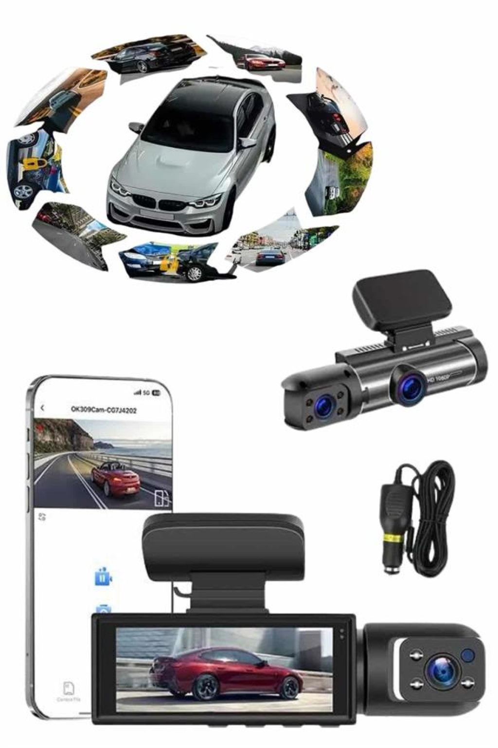 1080P 3 Lensli WİFİ Araç İçi Kameralı Ekran DVR Kaydedici Gece Görüşlü