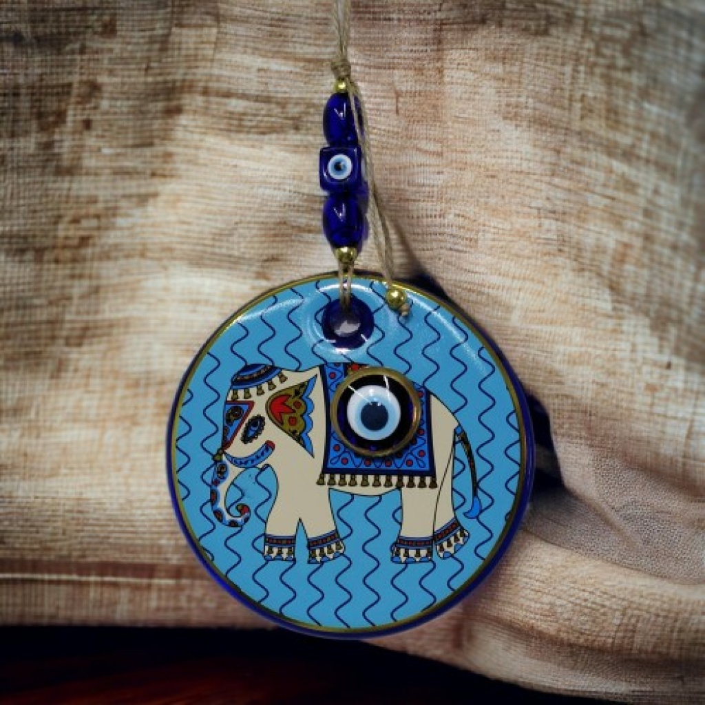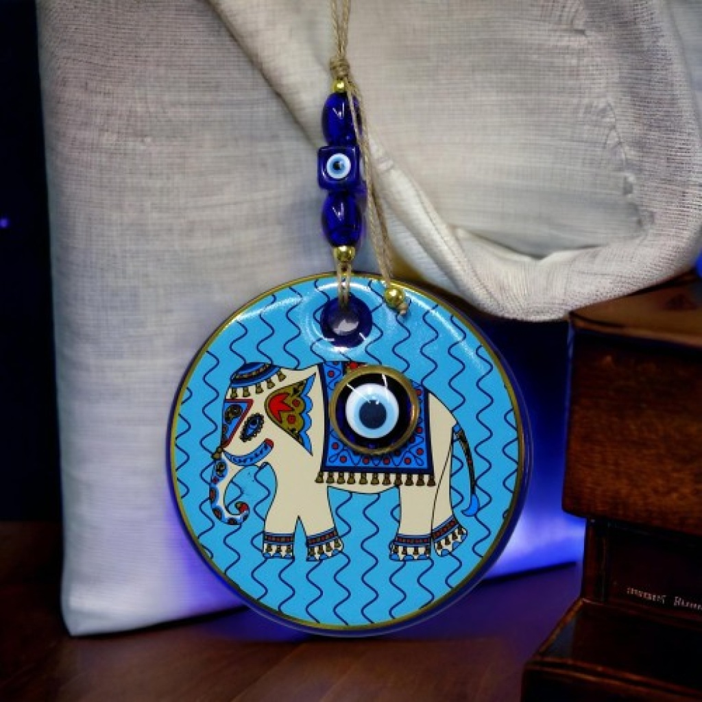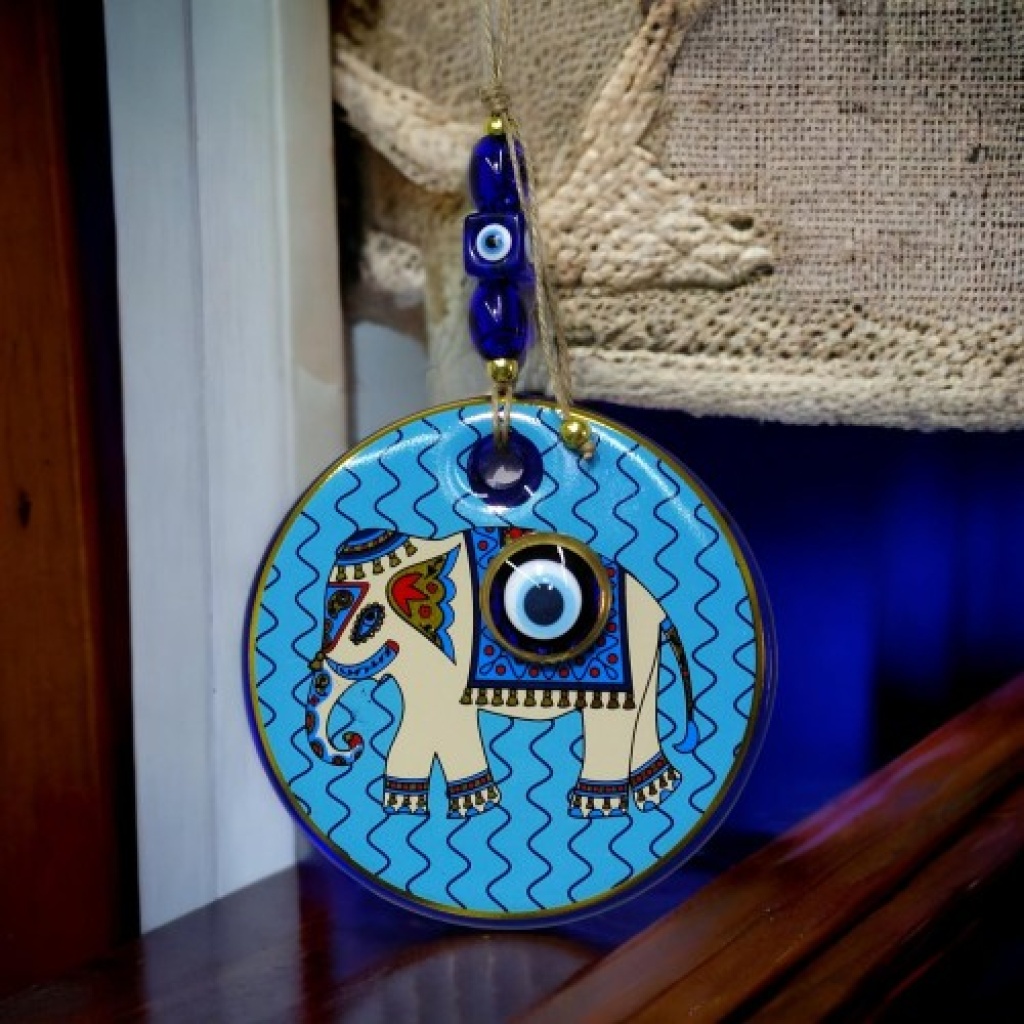 Yaldızlı Fil Modelli Nazar Boncuklu Duvar Süsü Mavi Camlı Duvar Dekoru